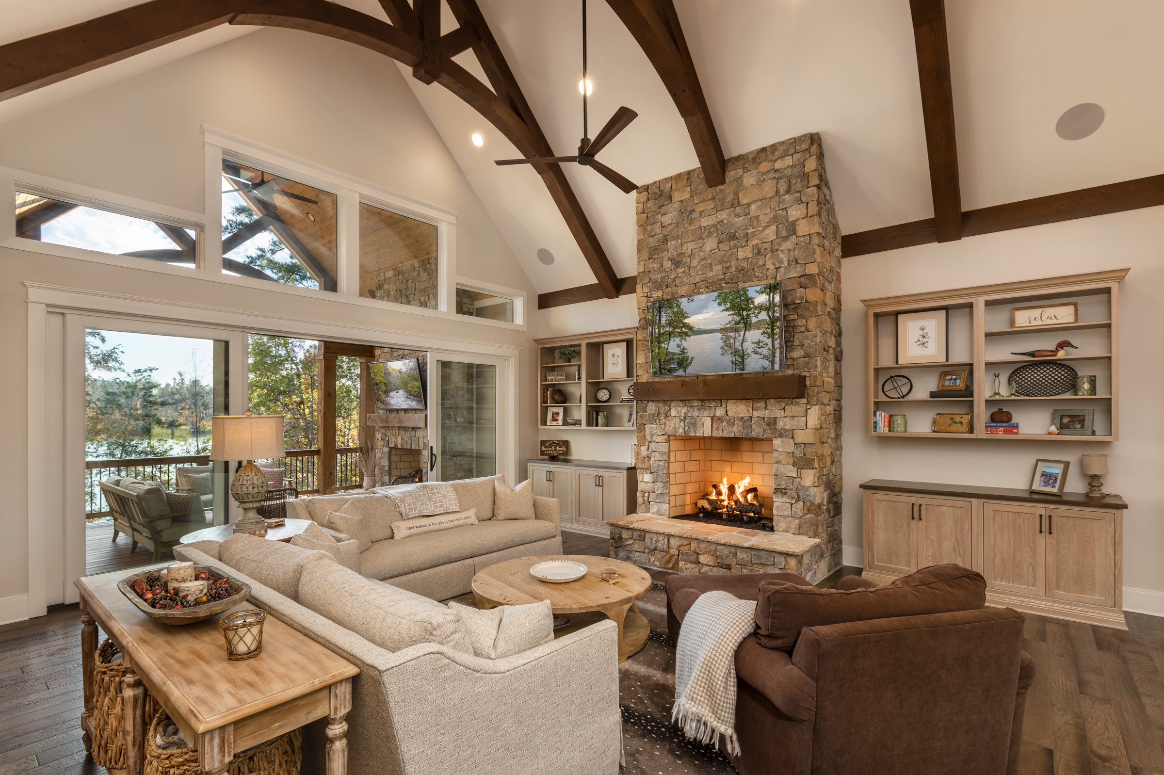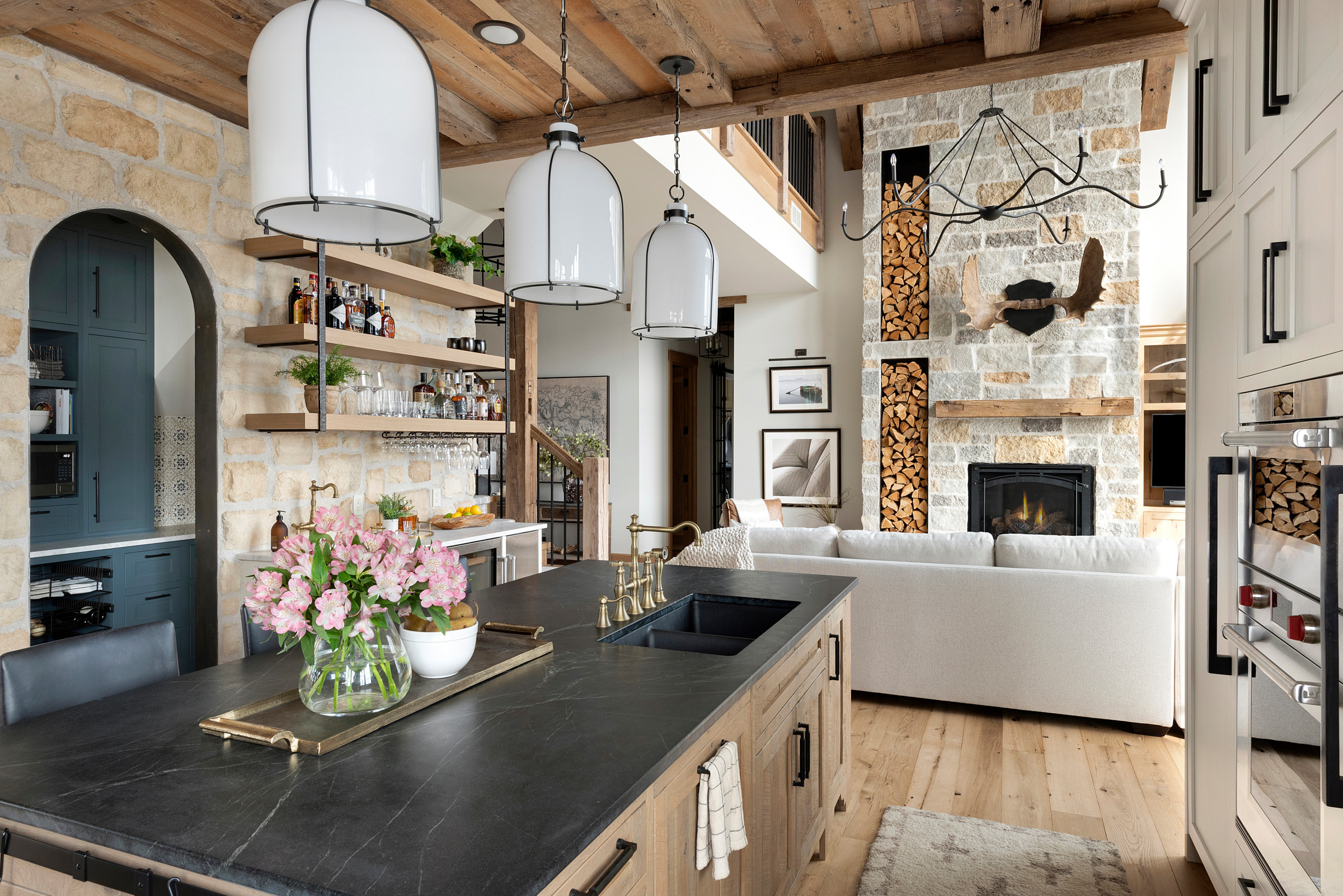 Unlike the luxe elements of other interior designs, rustic decor style is simply unpretentious. A rustic vibe will not rely on ornate centerpieces or chandeliers. Instead, rustic interior styling may include throw pillows made out of burlap, cowhide rugs, and wood walls or side tables. The main element of designing a rustic home is to create a space that is warm, inviting, and as natural as possible. From a stone fireplace to a mason jar to countertops with raw edges, a rustic touch is soft, natural, or both.